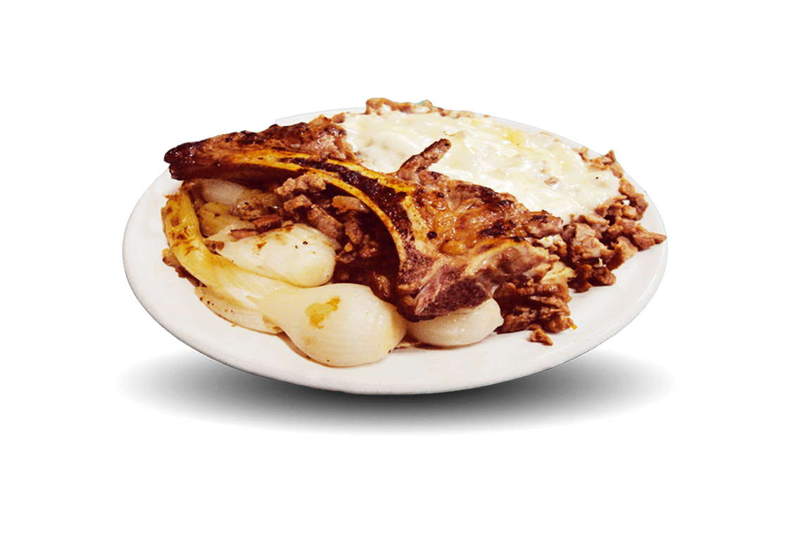 Chuleta, costilla, tocino, cebolla, pimiento, jitomate y queso.