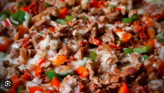 Pastor, tocino, cebolla, pimiento, jitomate y queso.