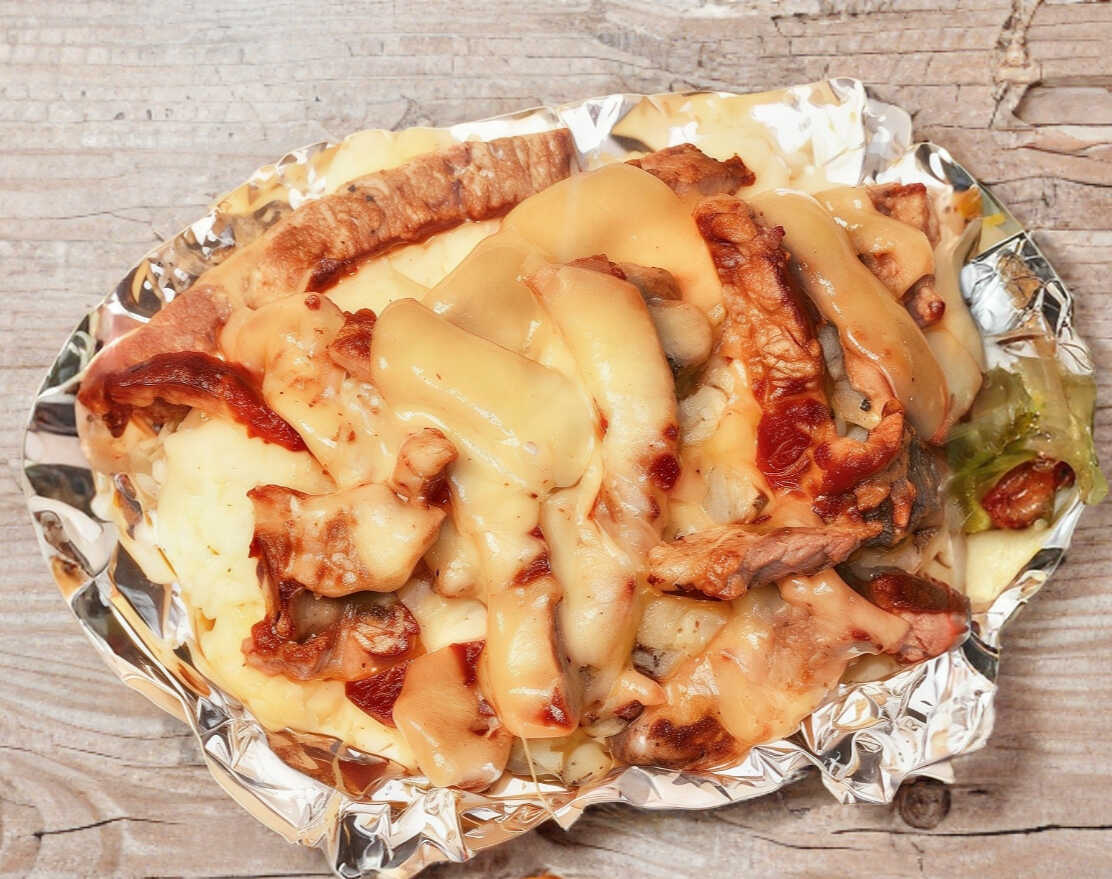 Chuleta, chorizo, cebolla, jamón, pastor y queso.