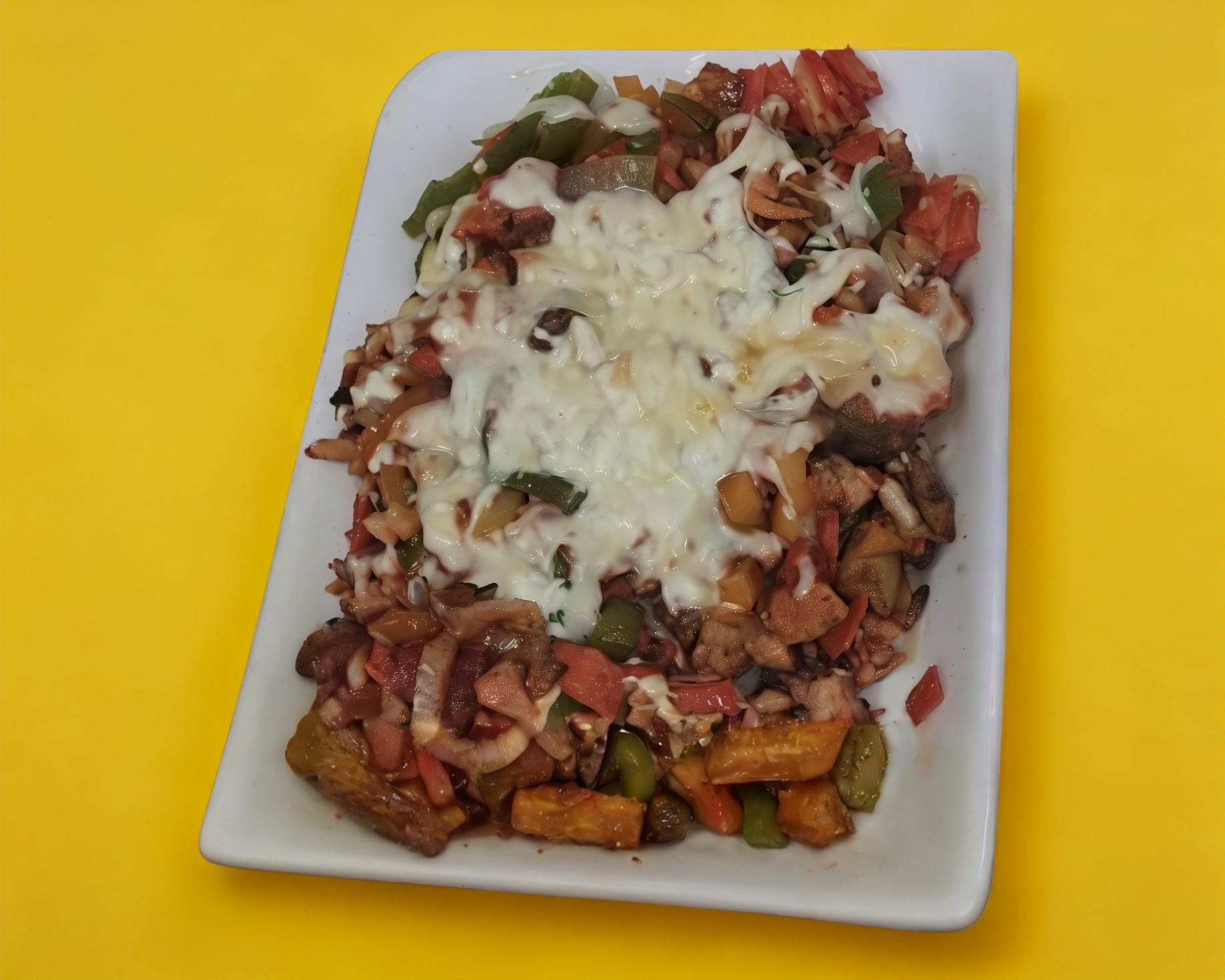 Bisteck, morrón cebolla jitomate jamón tocino y queso