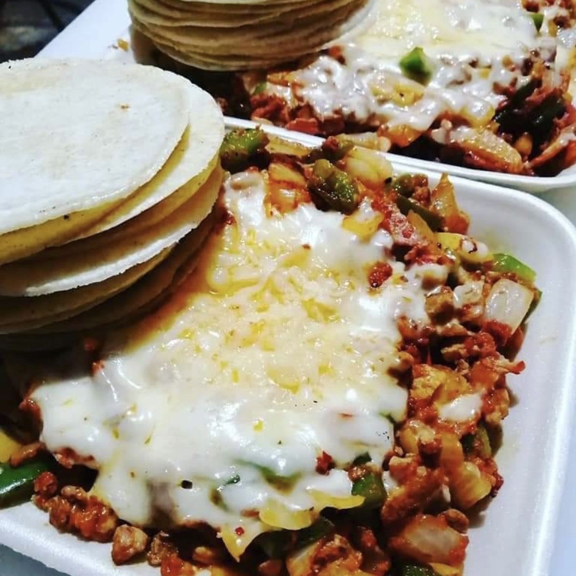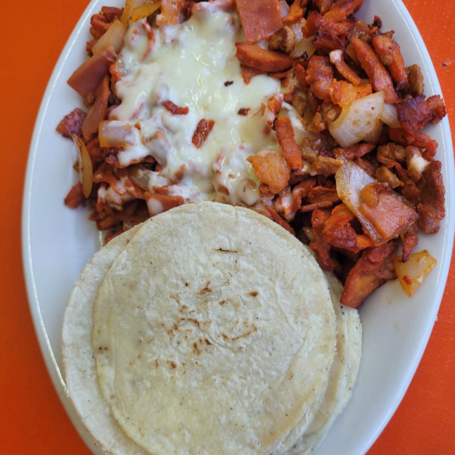 Bistec, pastor, jamon, tocino, cebolla y queso.
