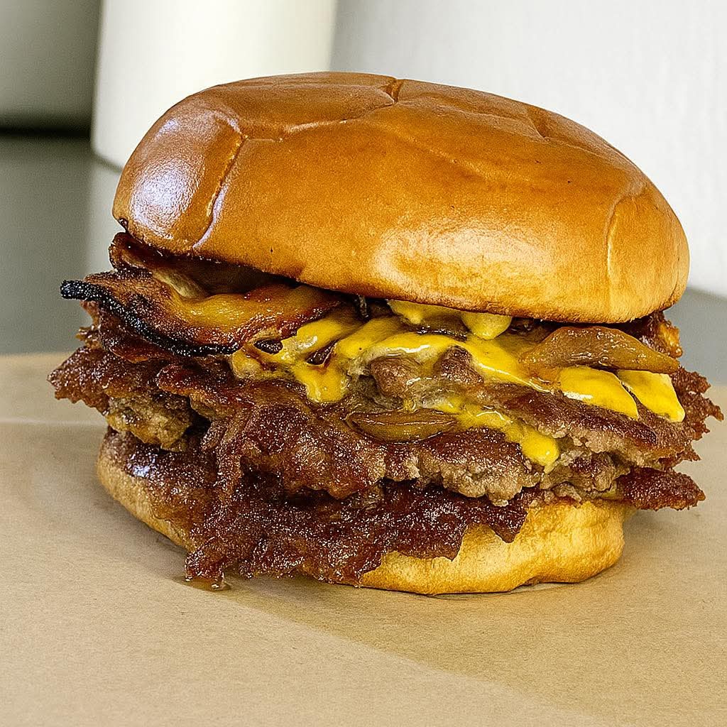 Dos carnes de res, dos quesos, jamón, tocino y cebolla caramelizada
