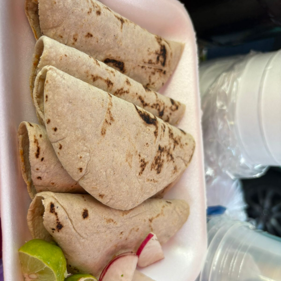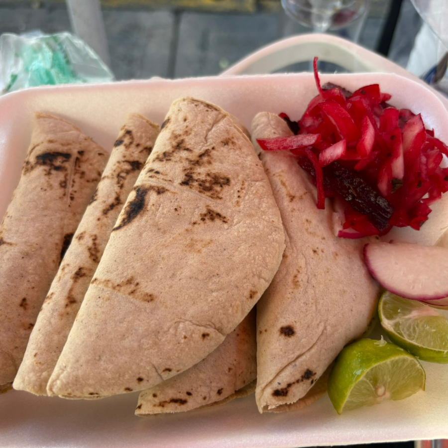 tacos de cecina frita, acompañado de cebolla abanero al gusto