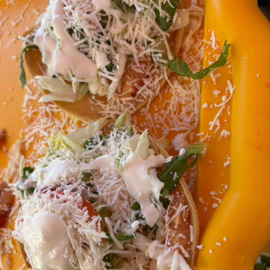 tostadas de pollo con papa, frijol, verdura romanita con col, crema y queso