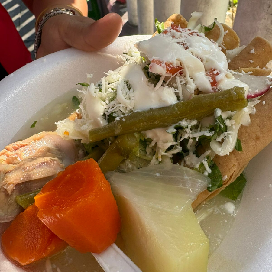 tacos dorados de pollo servido con caldo de verduras y pieza de pollo