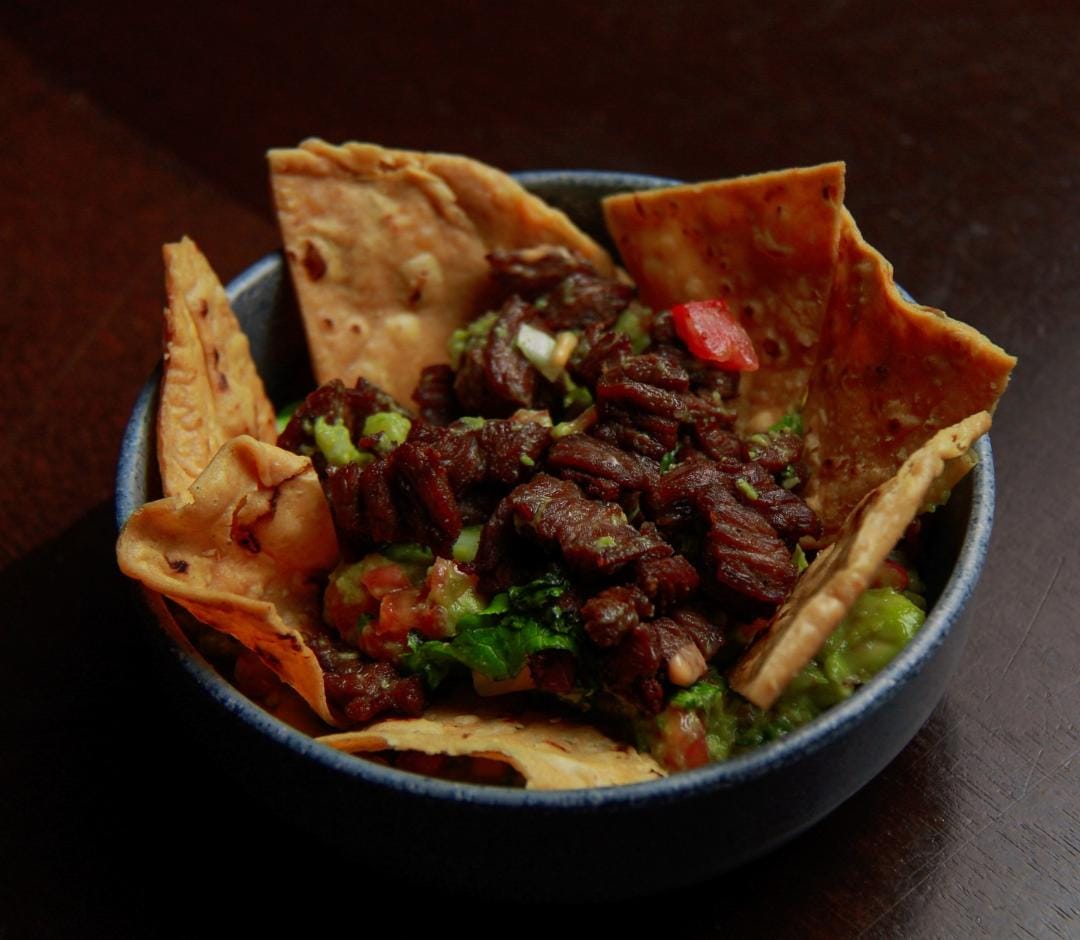 Cubos de arrachera fritos sobre una cama de guacamole acompañado de totopos, salsa martajada y pico de gallo
