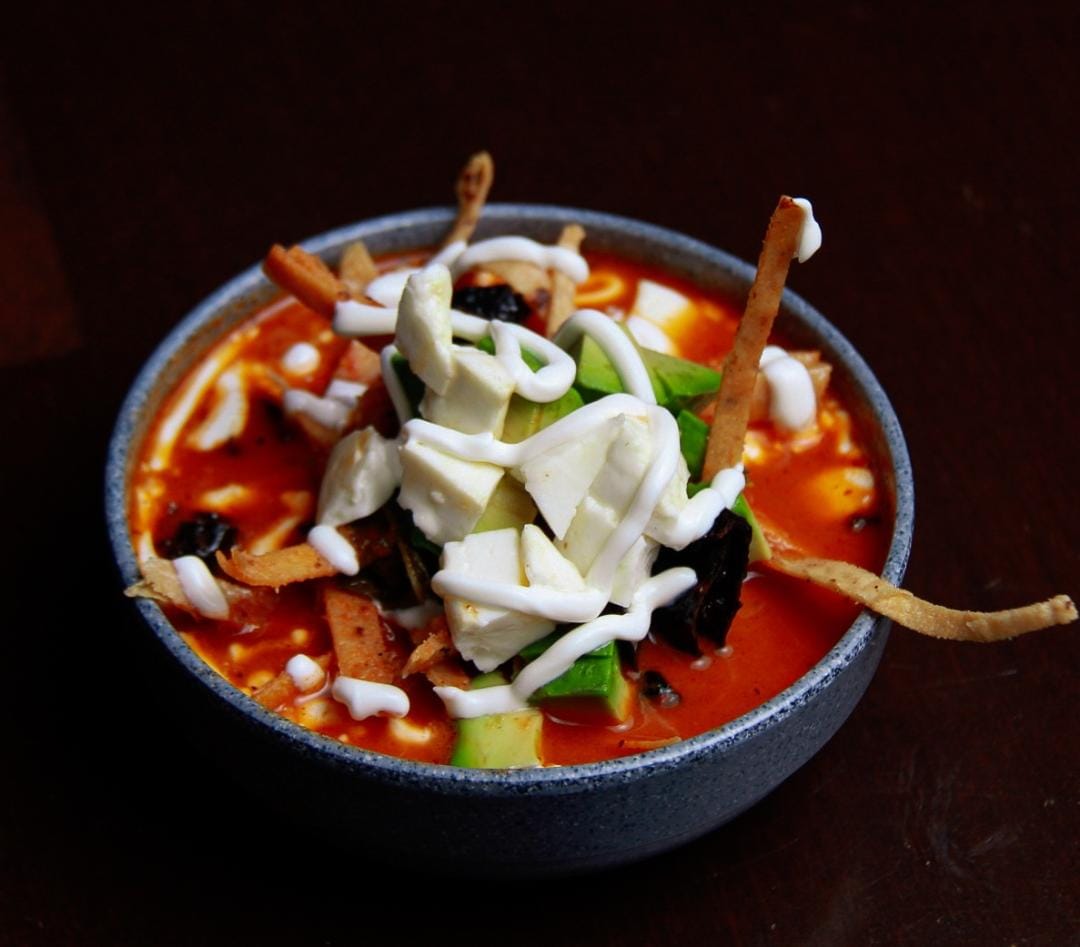 Deliciosa juliana de tortilla frita bañada con caldo, elaborado con chile guajillo, tomate, cebolla y decorado con cubos de aguacate, chile pasilla frito, chicharrón, crema y cubos de queso