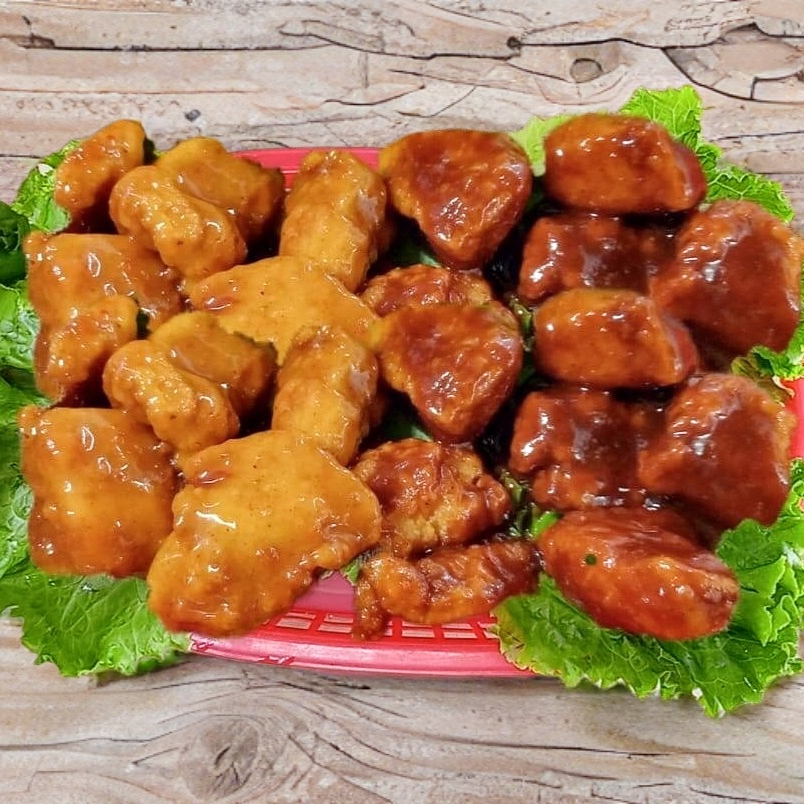 24 pzas, 3 salsa a elegir, 2 aderezos Ranch, verduras como complemento apio y zanahoria.