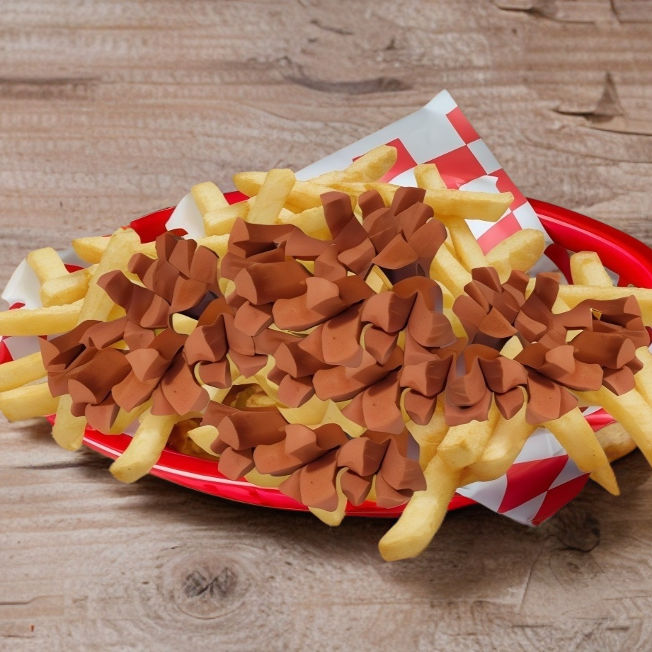 Trocitos de salchicha con papas a la francesa.