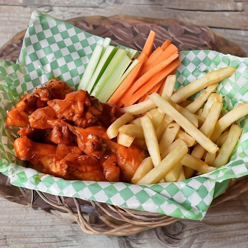 12 piezas de Boneless, 2 salsa a elegir, 1 aderezo ranch 2 onzas , verduras como complemento apio y zanahoria.