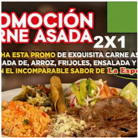 Aprovecha esta promo de exquisita carne asada. Acompañada de arroz, frijoles, ensalada y rajas. Todo con el incomparable sabor de La Especial.