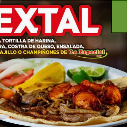 Tortilla de harina, arrachera, costra de queso, ensalada, papas al ajillo o champiñones La Especial.