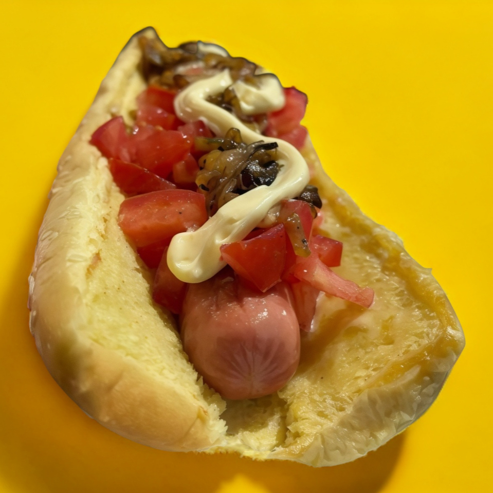 Salchicha, jitomate, cebolla, mayonesa y cátsup.