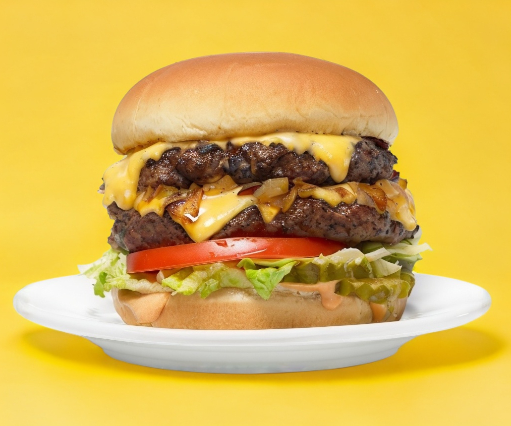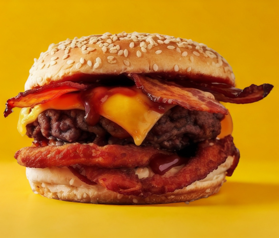 Jitomate, lechuga, cebolla, doble carne de res, tocino, queso gouda y queso chedar.