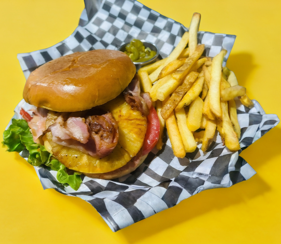 Jitomate, lechuga, cebolla, piña, jamón ahumado, carne de res, tocino, queso gouda, queso chedar y 150gr de Papas a la Francesa.