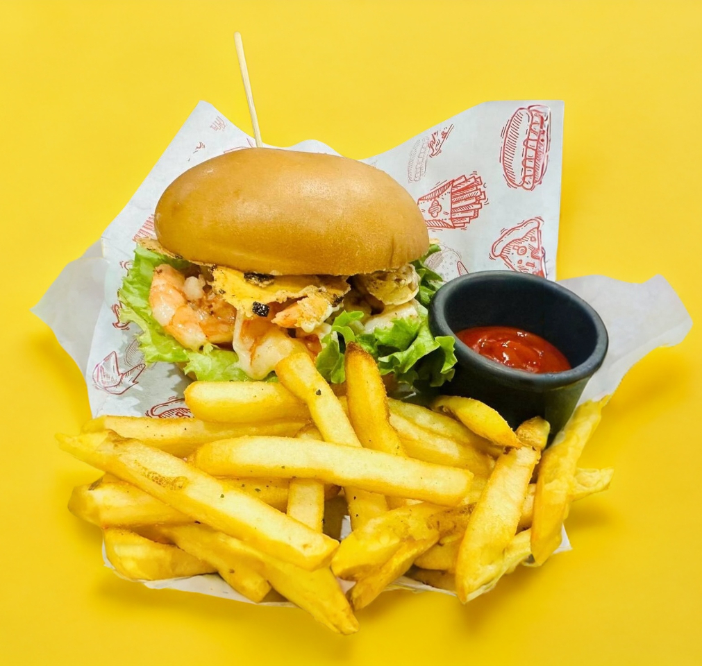 hamburguesa de camaron con costra de queso