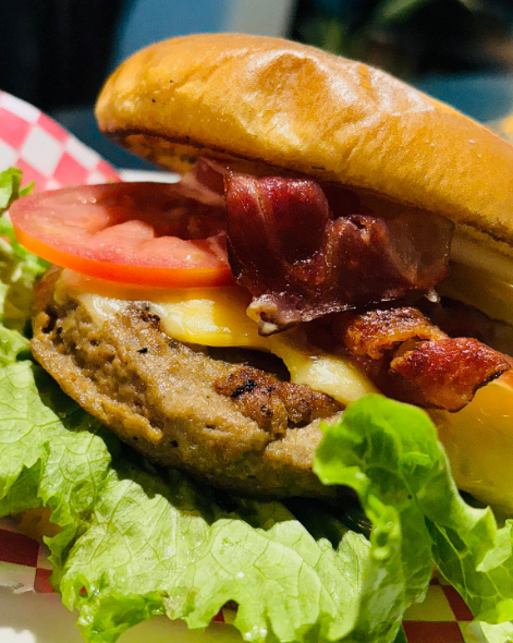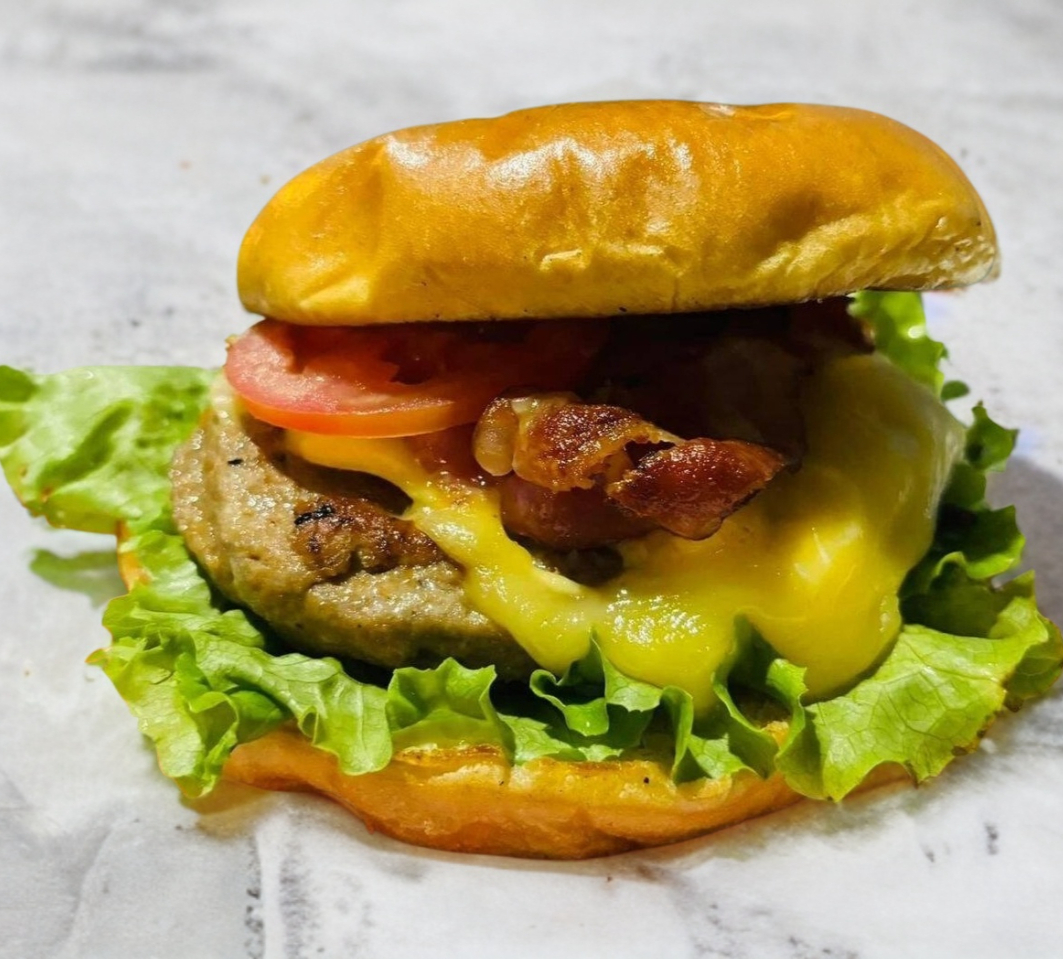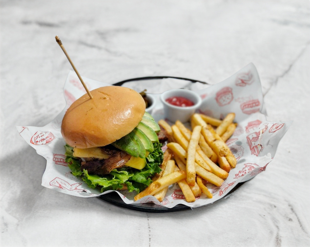 Rápida, fresca y poderosa. Carne de res 150gr jugosa, coronada con aguacate, queso cheddar y queso gouda gratinados, tocino crujiente lechuga fresca, cebolla y jitomate.