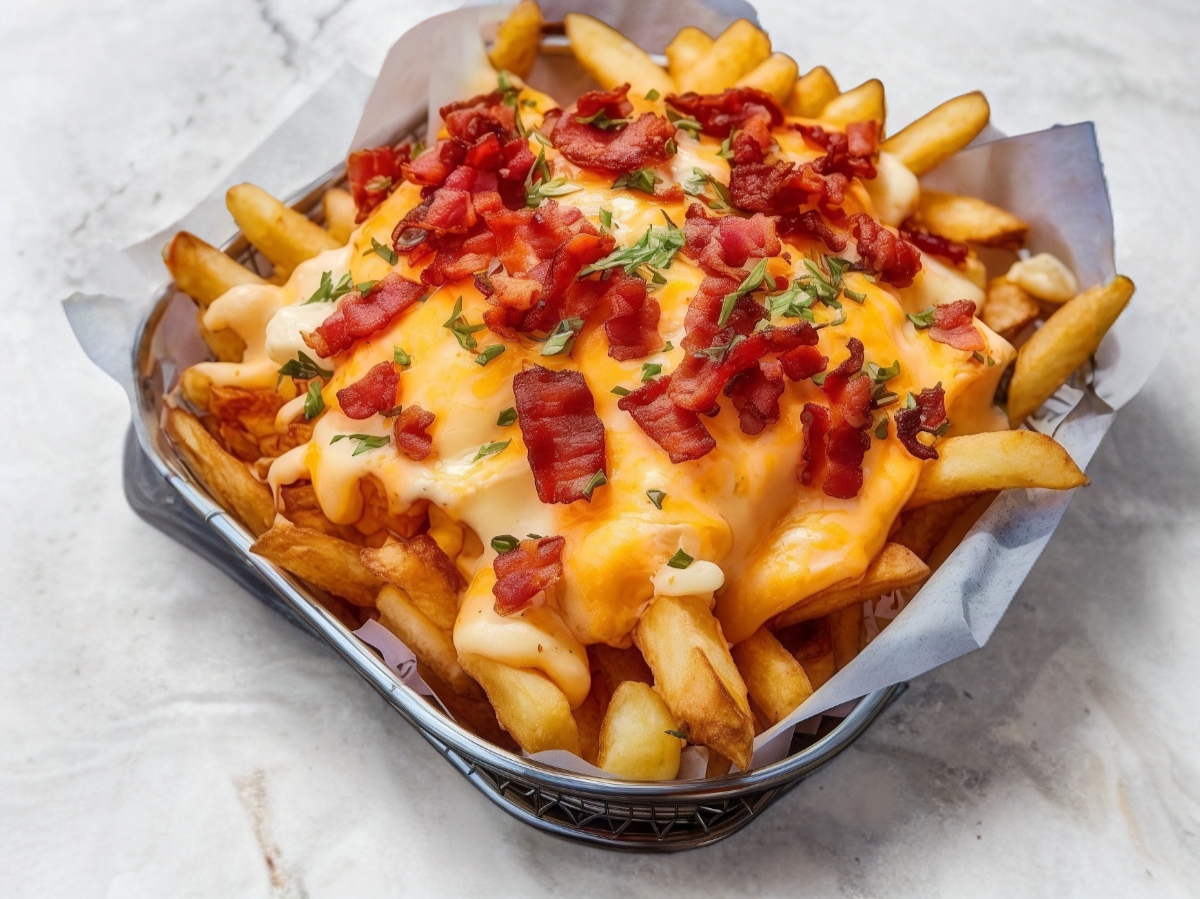 Papas a la francesa o gajo (300gr), cubiertas con queso fundido y crujiente tocino.