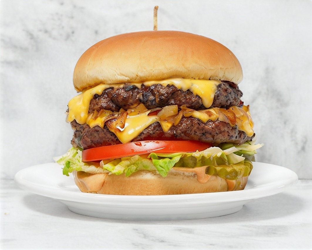 Jitomate, lechuga, cebolla, doble carne de res, tocino, queso gouda y queso chedar.
