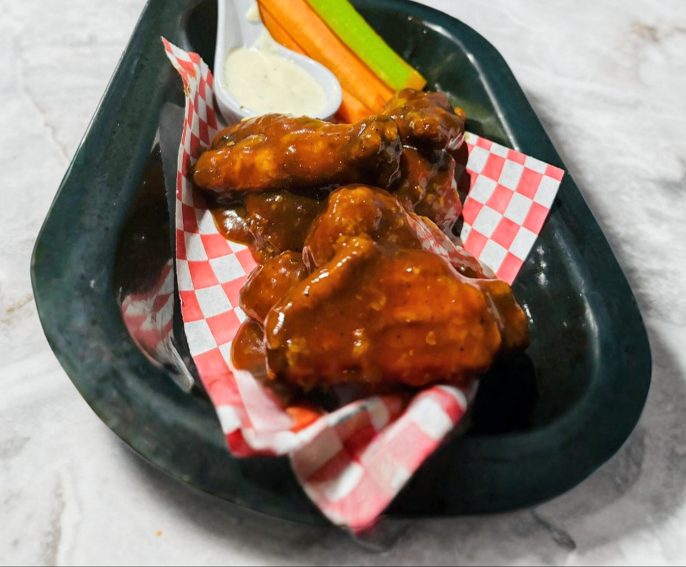 Alitas 1.765 kg bañadas en salsa a elegir, acompañadas de verduras y aderezo.