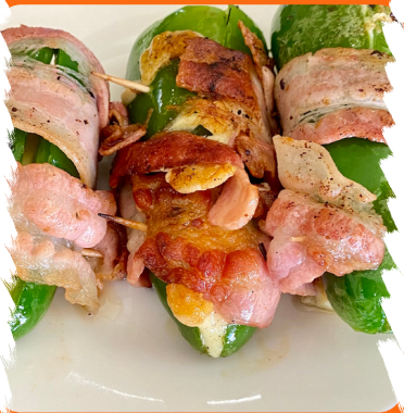 3 Piezas de jalapeños toreados, rellenos de queso gouda y envueltos en tocino.