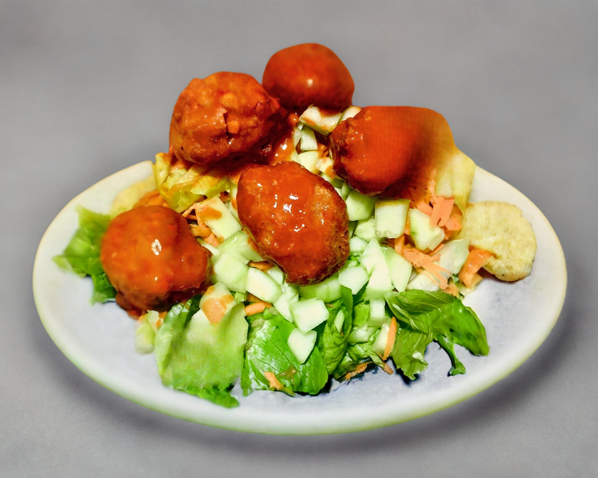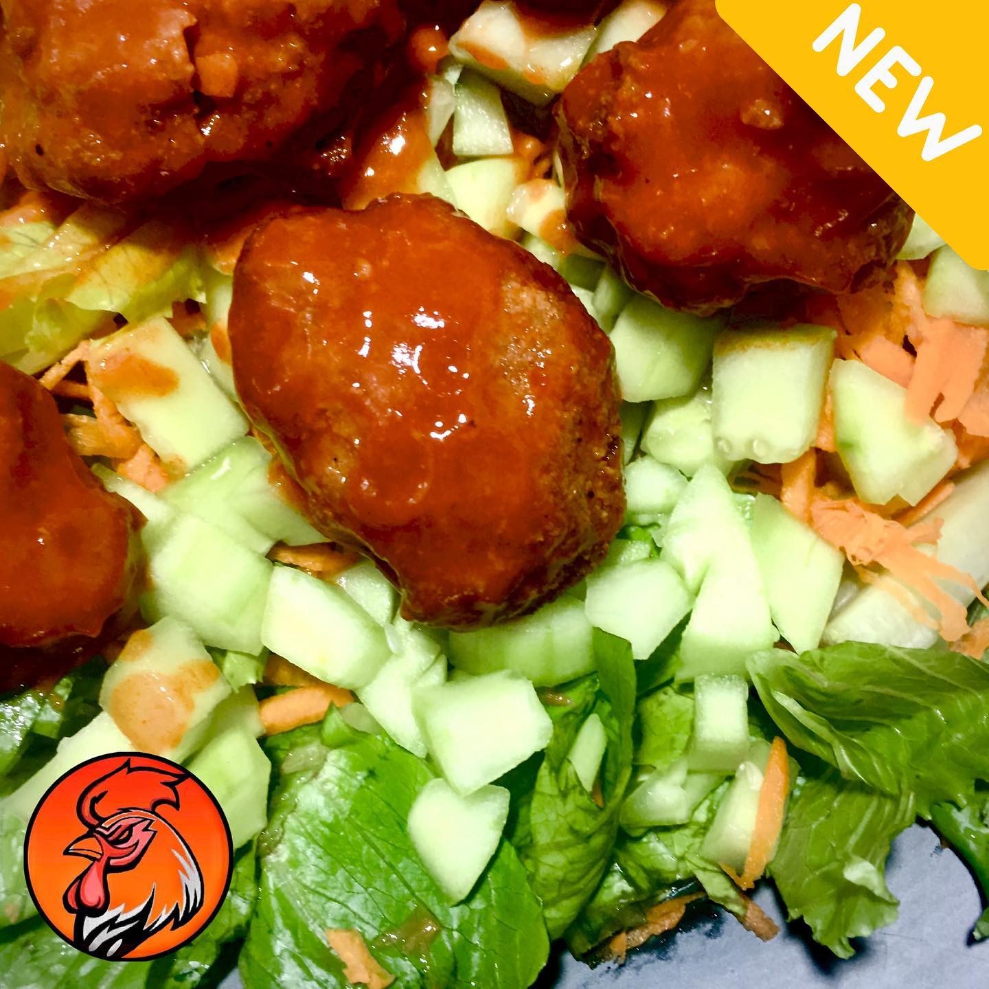 Una deliciosa combinación de lechuga fresca con pepino y zanahoria rallada, acompañada de 6 piezas de boneless bañados en tu salsa favorita y un aderezo honey mustard.
