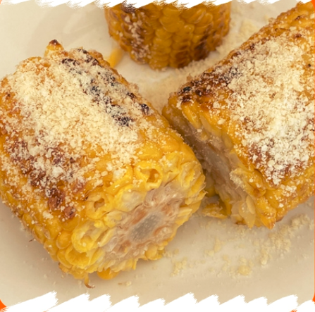 Dos medios elotitos amarillos sazonados con mantequilla, queso parmesano y acompañado de aderezo ranch.