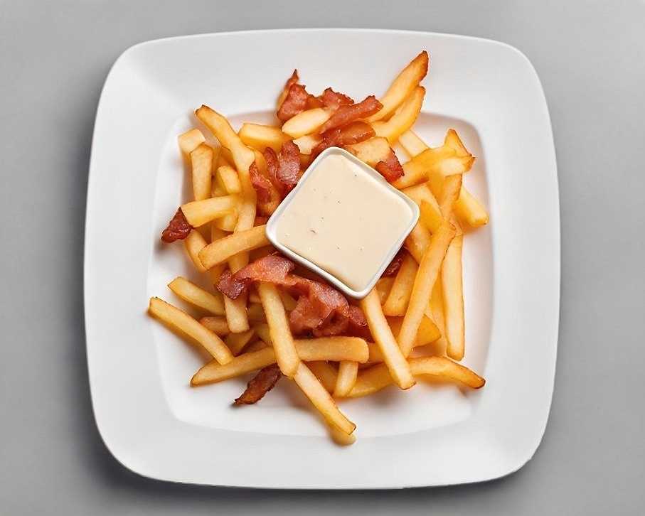 250G de papas curly con queso gouda gratinado y tocino frito.