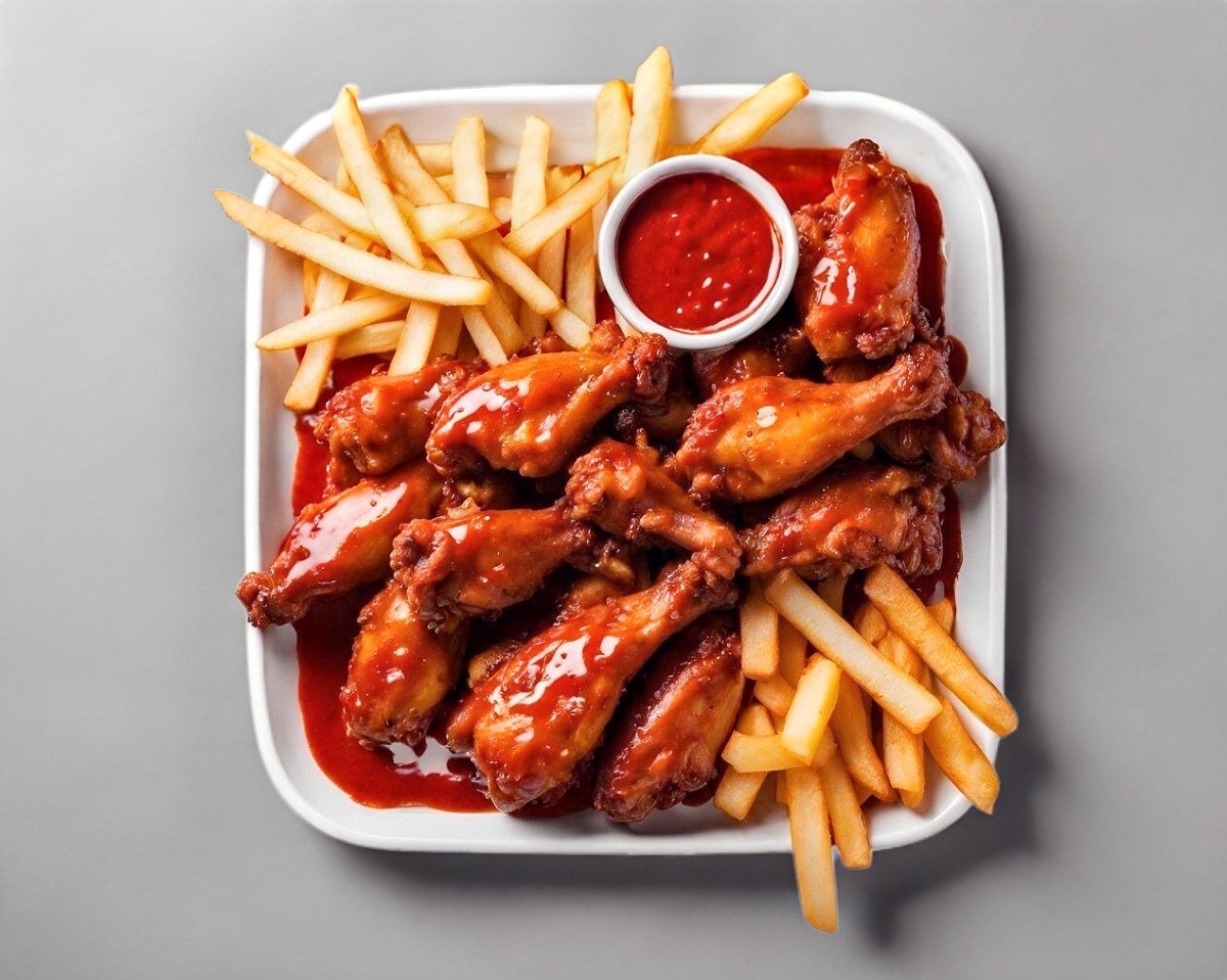 Tus alitas o boneless, bañados en tu salsa favorita, acompañados de unas crujientes papas a la francesa (250g), vegetales y un aderezo ranch.