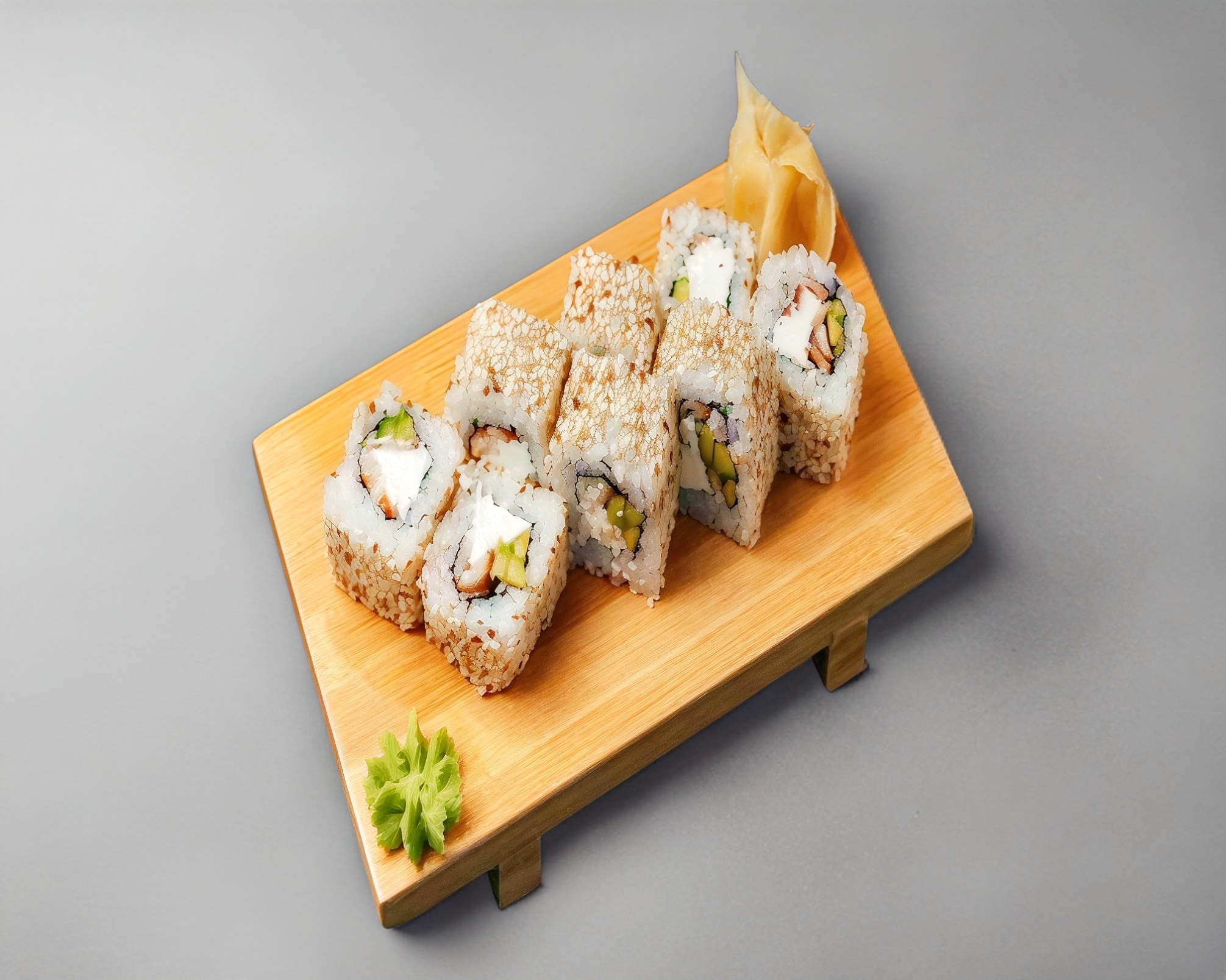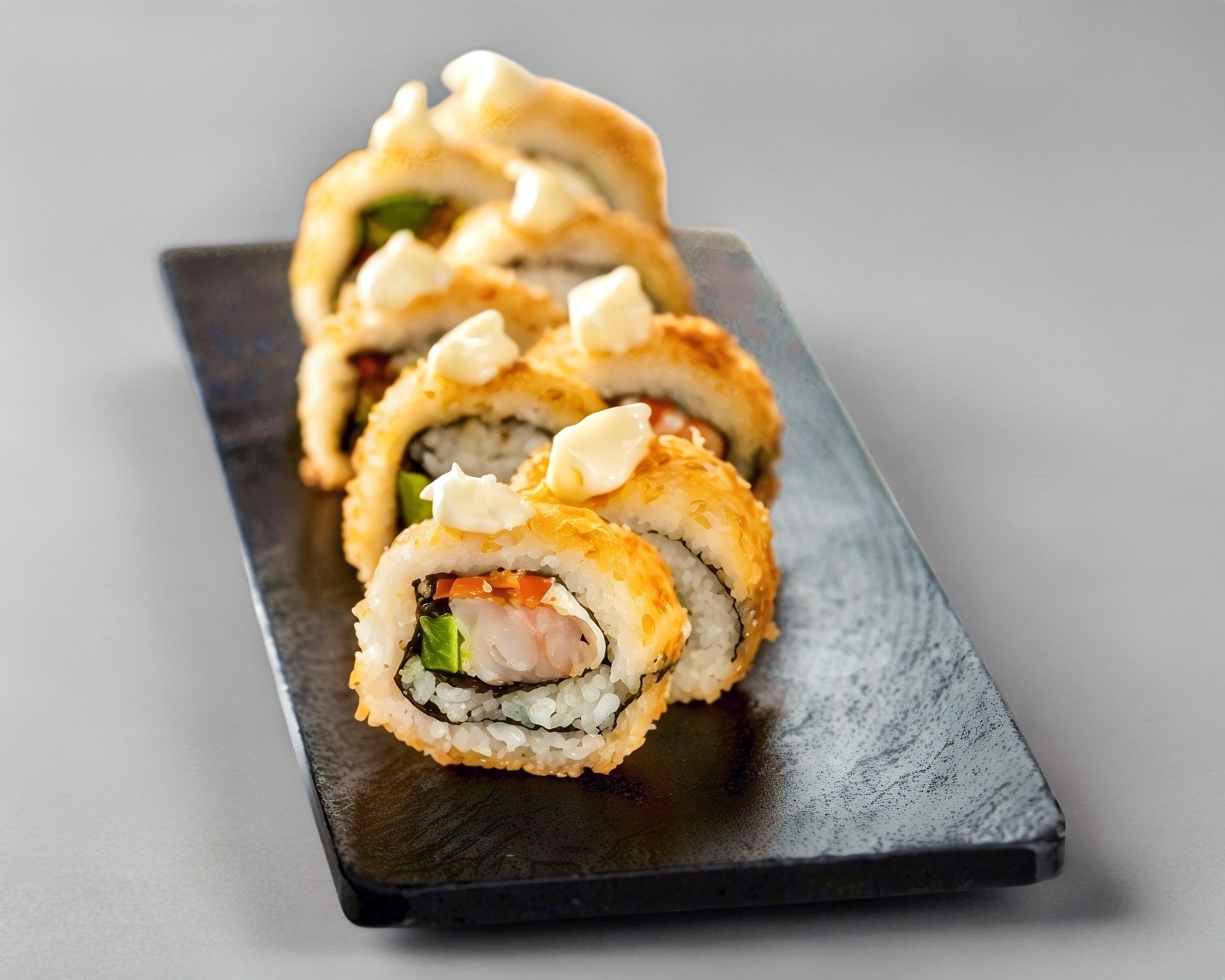 Rollo relleno de camarón empanizado, queso crema, camarón, laminado de mango y aguacate, bañado de anguila y nuez. (10 pzas).