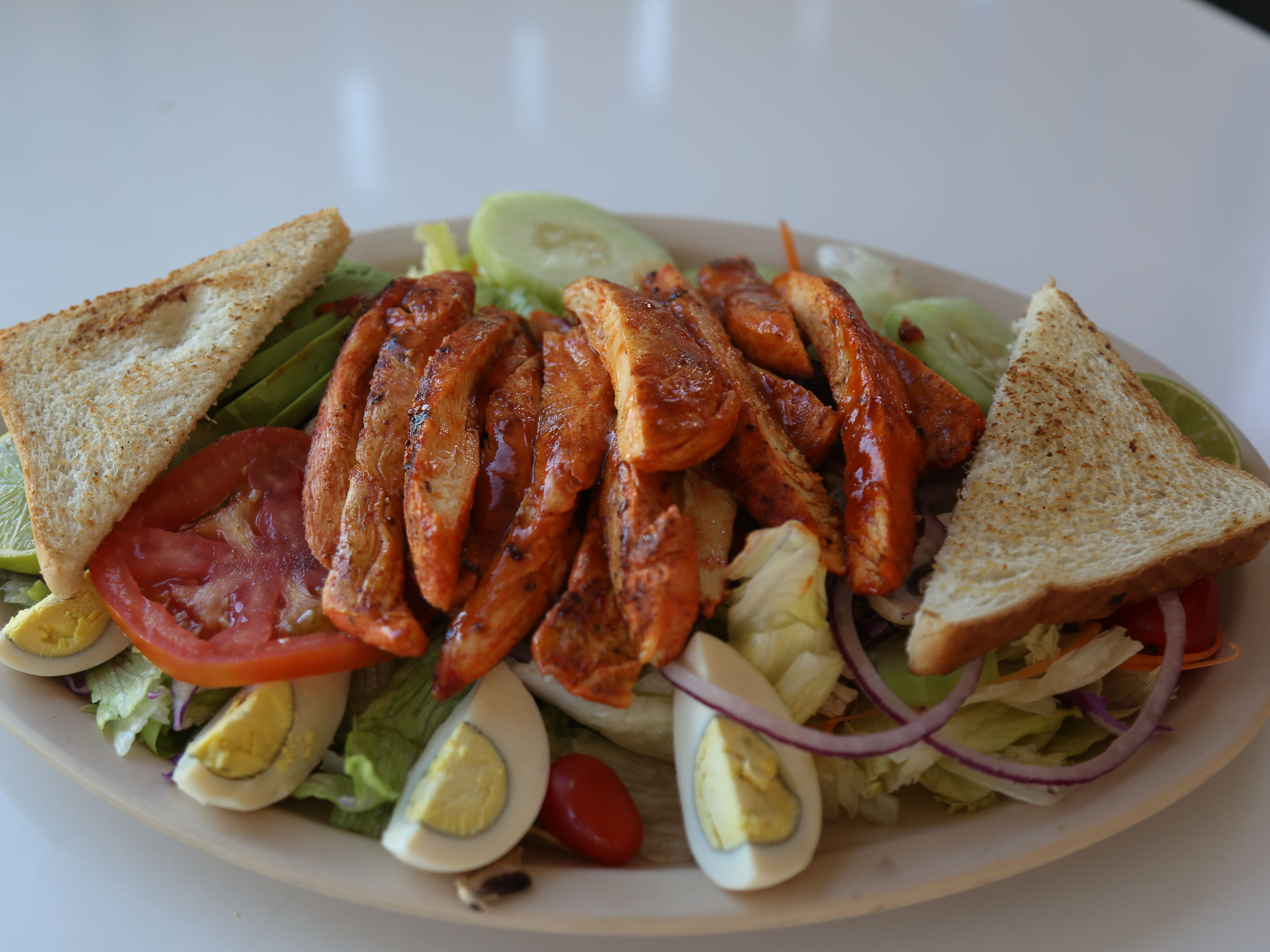 Base con lechuga orejona, lechuga romana, col morada y zanahoria. Ingredientes adicionales: jitomate, cebolla, pepino, huevo, limón, pan tostado, aderezos.