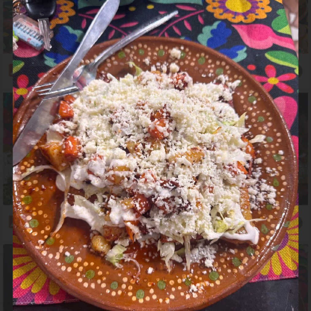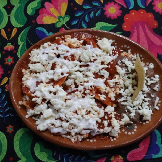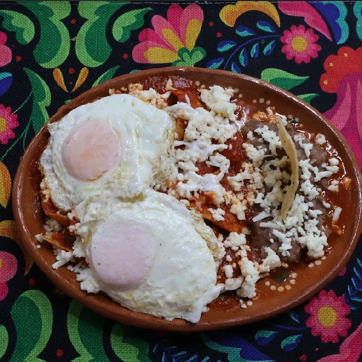 Estrellados en tortilla dorada, salsa ranchera, frijoles y queso.