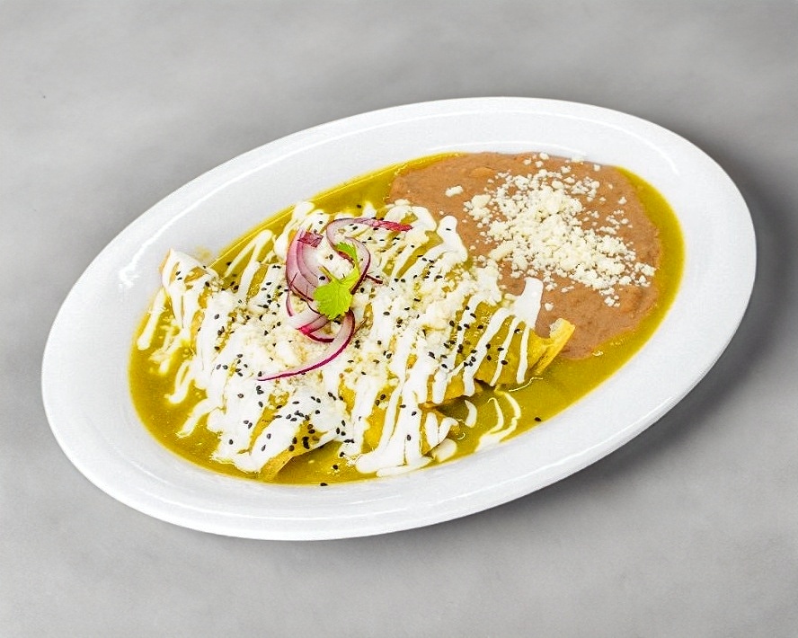 4 enchiladas de queso o de pollo en la salsa de tu elección. Acompañadas de frijoles.