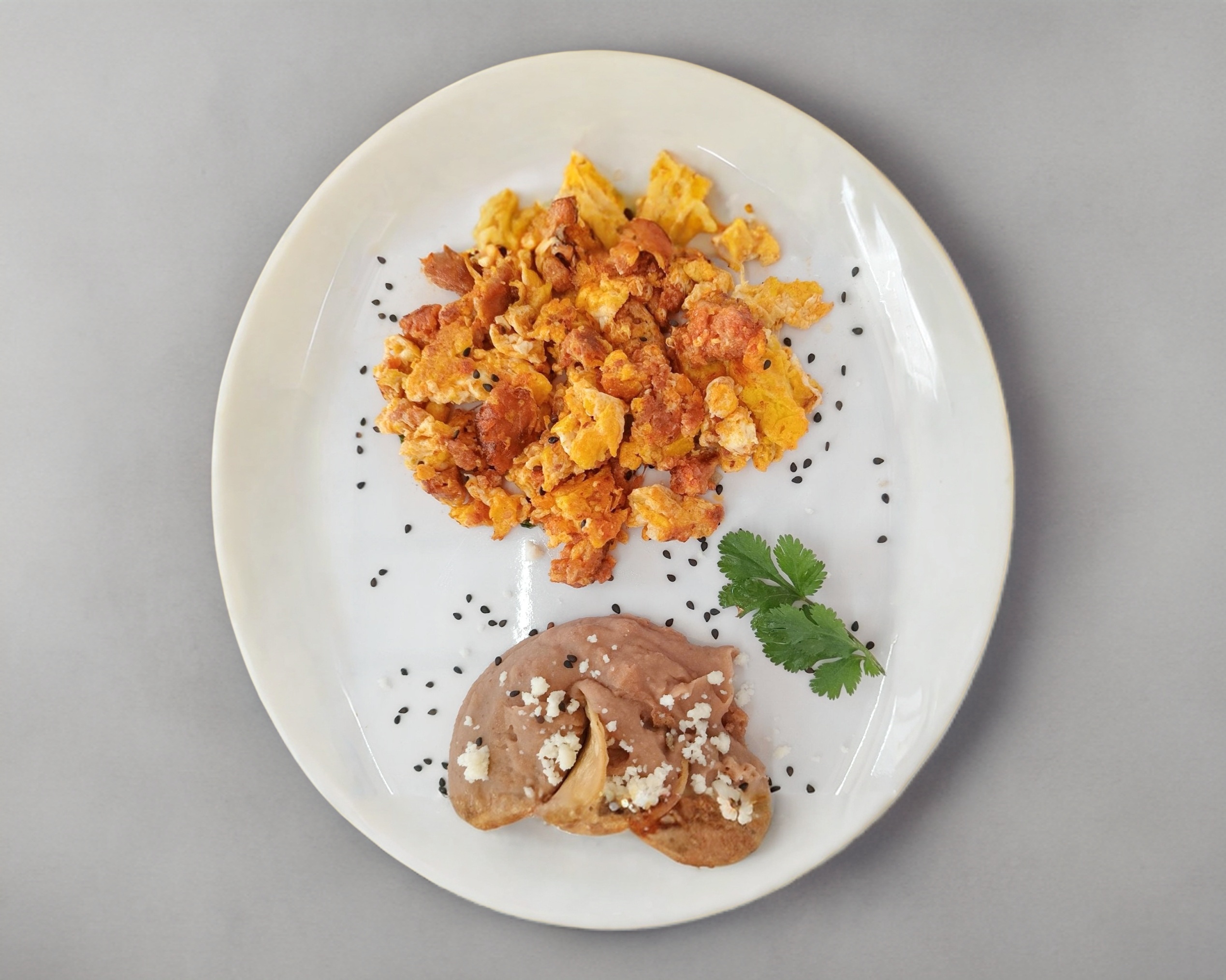 Una original combinacion de huevo revuelto con chicharron prensado doradito