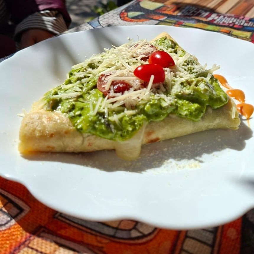 Deliciosa crepa salada rellena de una suave crema de espinacas, champiñones frescos, queso y un toque de pepperoni.