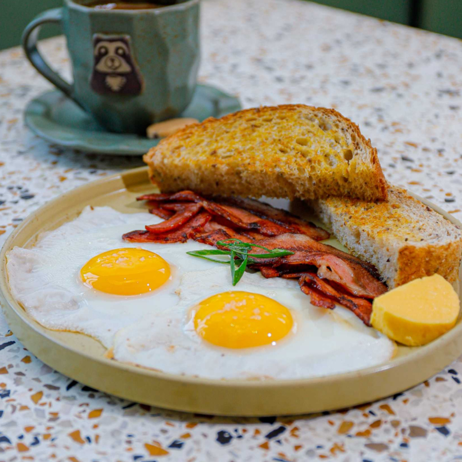 2 Huevos Estrellados, acompañados de frijoles refritos y pan.