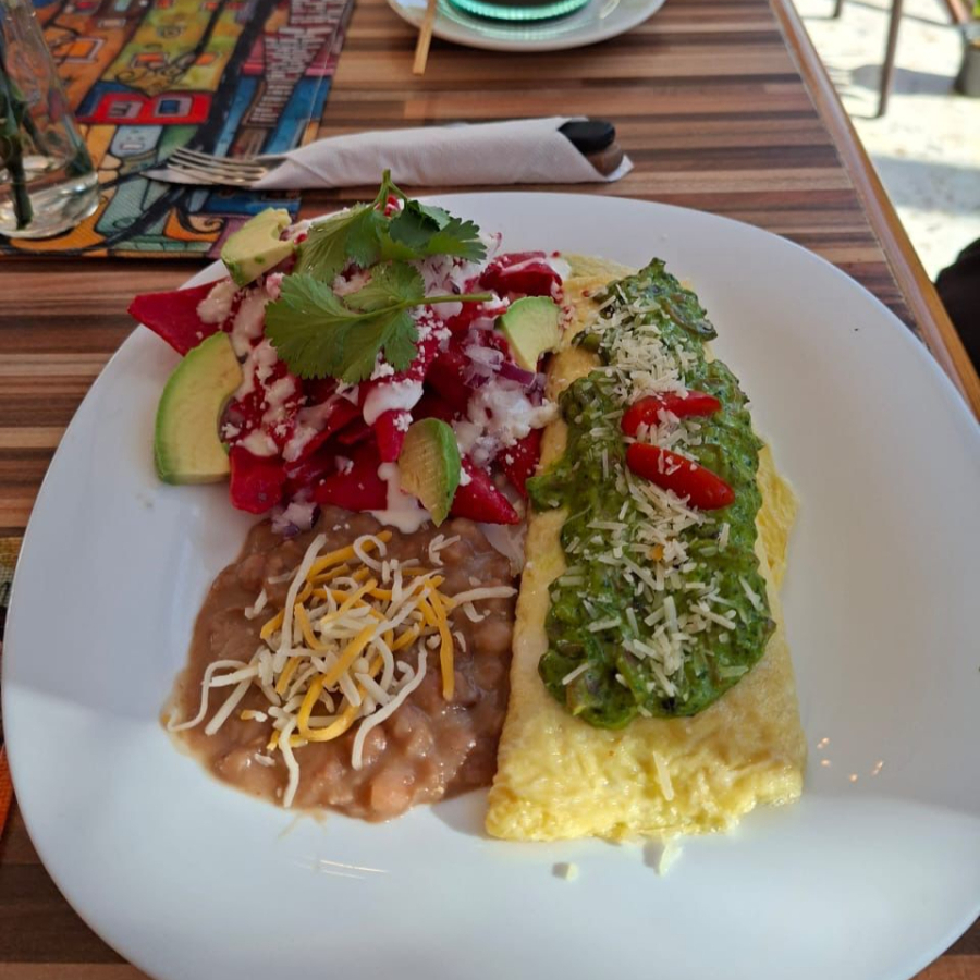 Esponjoso omelette relleno de queso fundido y jamón, bañado en una rica crema de champiñones y espinaca.
