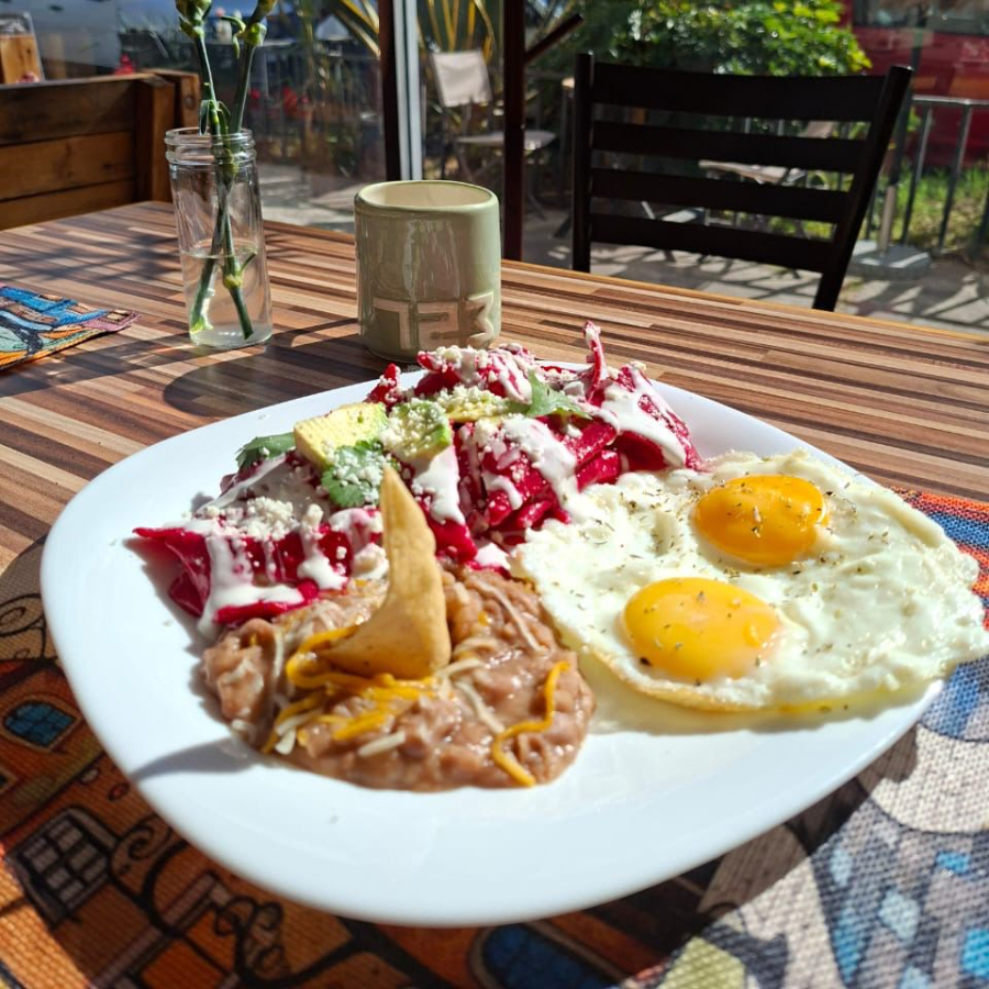 Tradicionales chilaquiles rojos o verdes, acompañados de huevo estrellado y frijoles refritos. Orden completa.