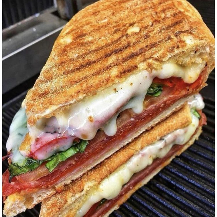 Exquisito pan de masa madre relleno mezcla de tres quesos, pepperoni, salami, jamón, espinaca, germinado, tomate, cebolla y pepinillos.