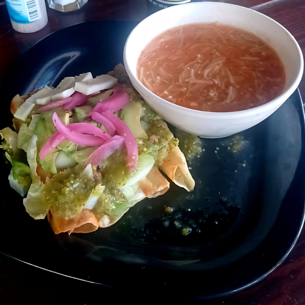Orden de 4 Flautas rellenas de Queso, bañados de crema y queso fresco. Incluye Sopa o Arroz para acompañar.