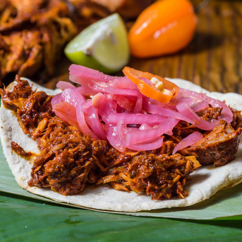Rico taco de Cochinita Pibil, tortilla de maiz con cebollita y chile habanero