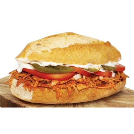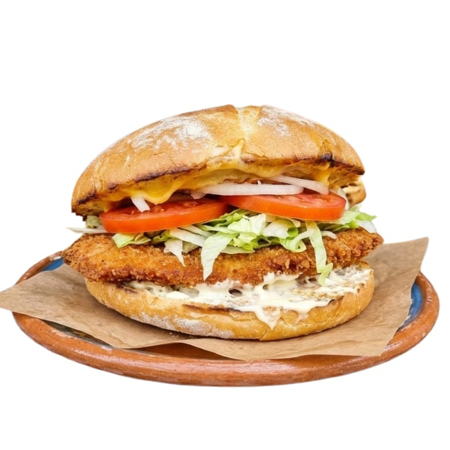 Milanesa empanizada de pollo, queso amarillo, cebolla, jitomate, lechuga, mayonesa, crema y aguacate.