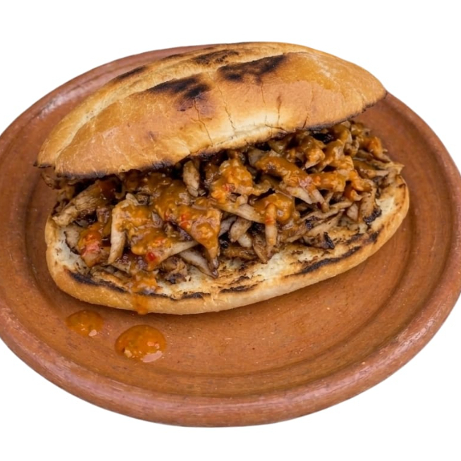 Deliciosa torta de cochinita pibil con jitomate, cebolla, lechuga, aguacate y bastante crema.