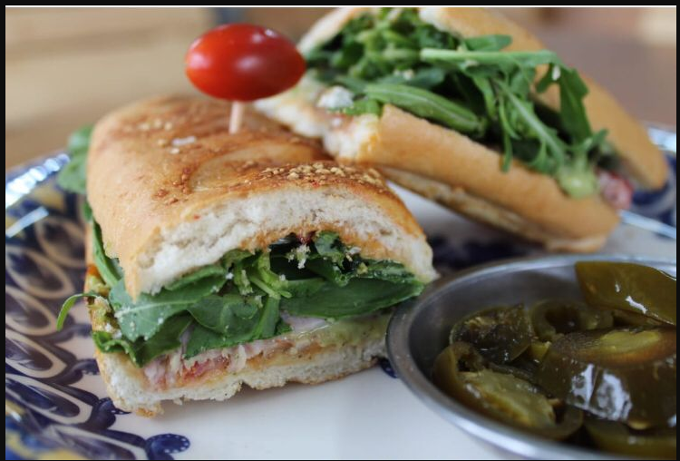 pan baguette, con aderezo mayo chipotle, jitomate, espinacas, aguacate, queso manchego o panela y chiles jalapenos