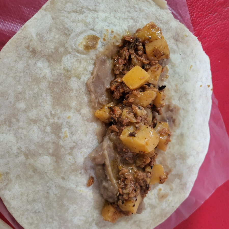Tortilla de harina acompañado de papas con chorizo.