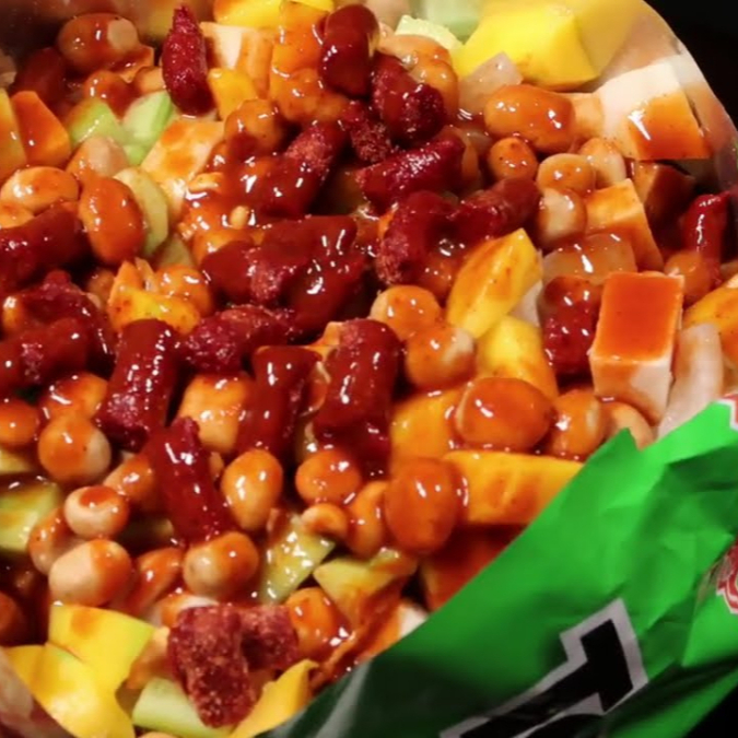 Cuerito, verdura, cacahuate y salsa.