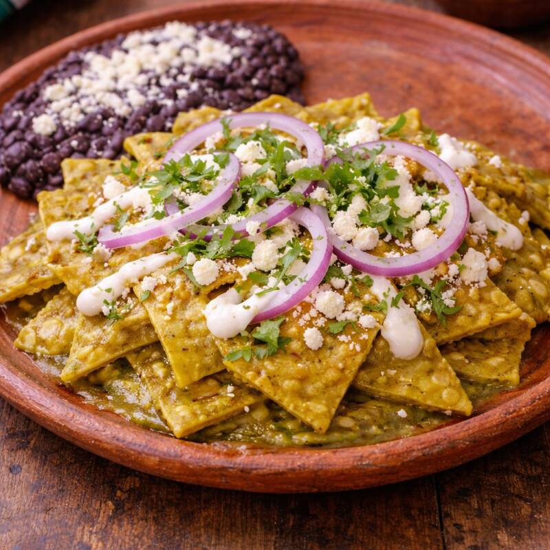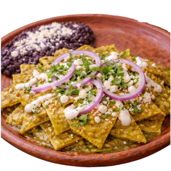 Totopos bañados en salsa verde SUPER PICANTE, cilantro, cebolla, queso y crema. Como guarnición, frijoles refritos.