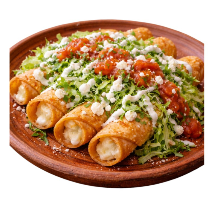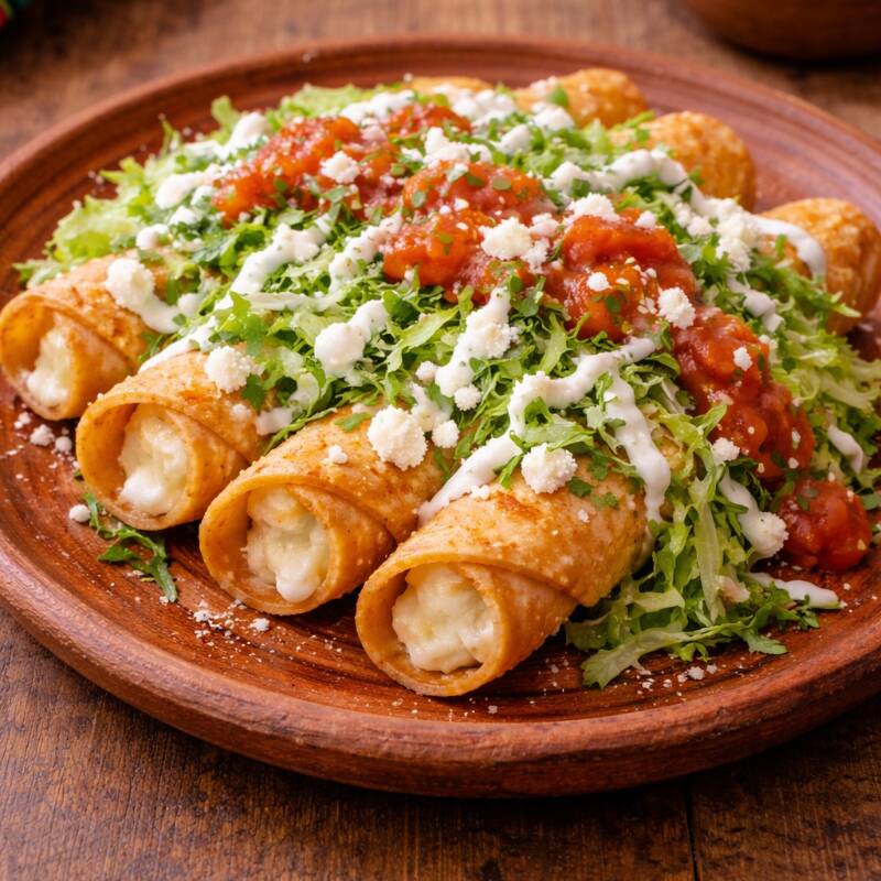 4 deliciosos tacos dorados rellenos de queso. Lechuga, queso, crema y salsa encima.