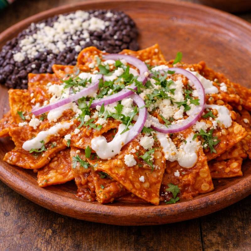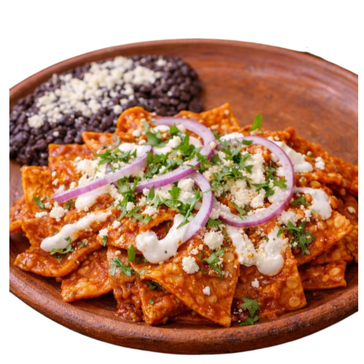 Totopos bañados en salsa roja SUPER PICANTE, cilantro, cebolla, queso y crema. Como guarnición, frijoles refritos.
