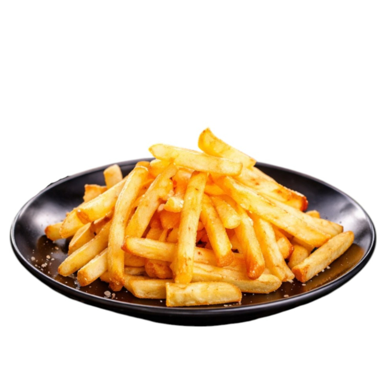Papas a la francesa con sal. Porción 150 gramos. Salsa catsup en recipiente.